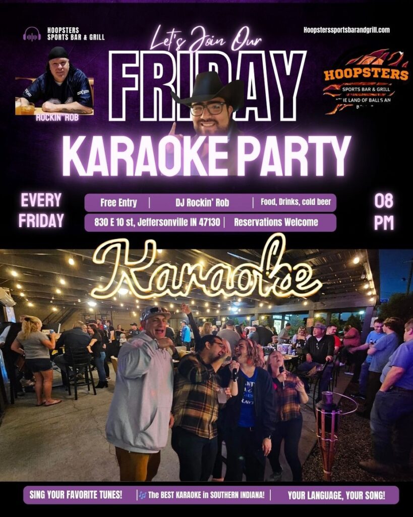 FRIDAY = KARAOKE NIGHT at Hoopsters! π€ Bring your friends, bring your voice (or just your cheering squad!), and let's have a blast! Food, drinks, and endless fun every Friday from 8 PM. Don't miss out! π #Hoopsters #KaraokeFriday #JeffersonvilleFun #NightOut